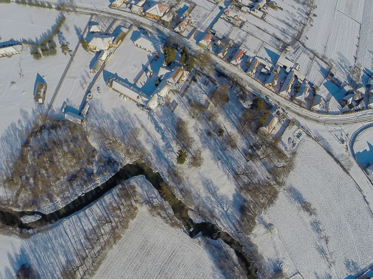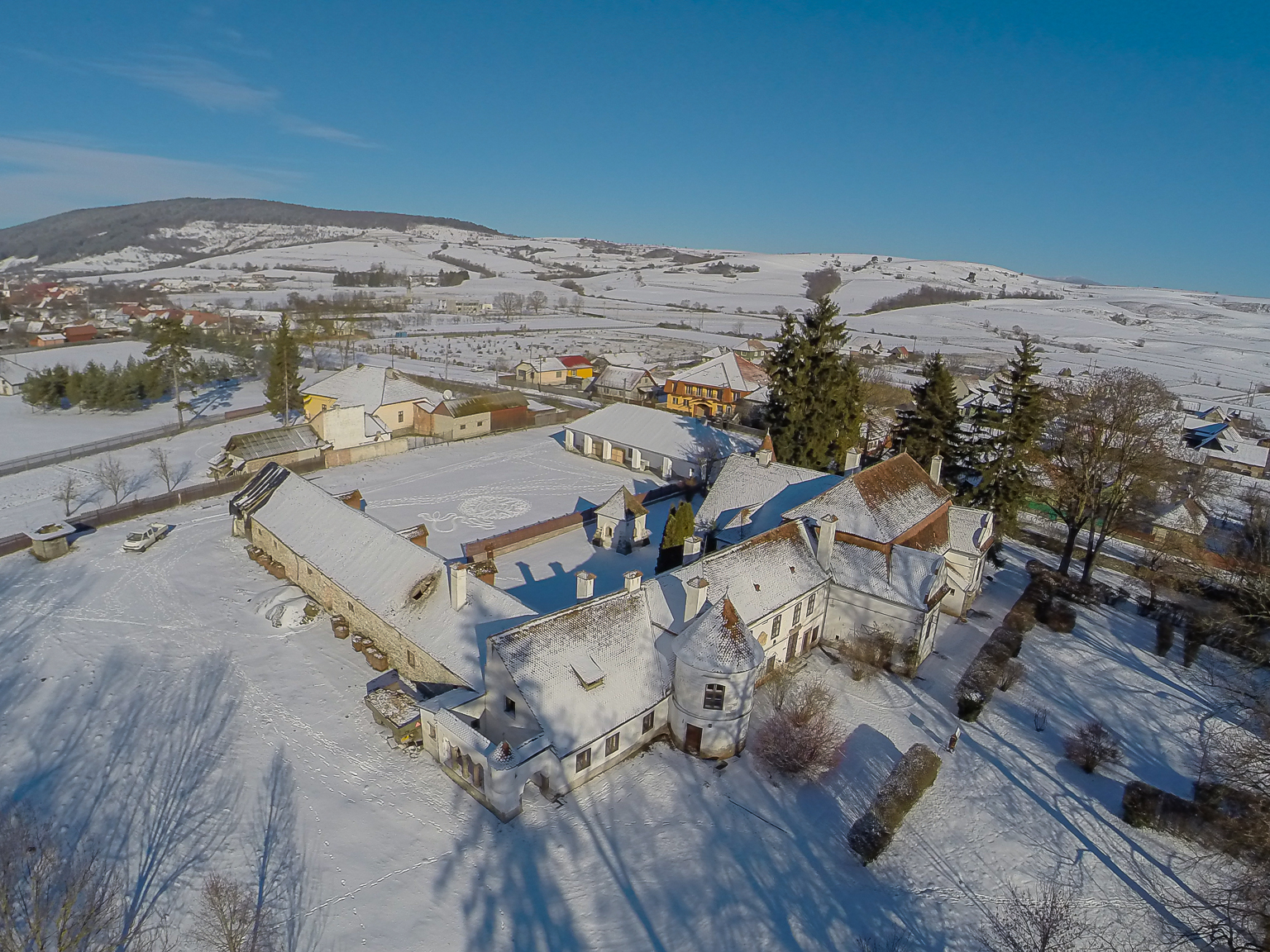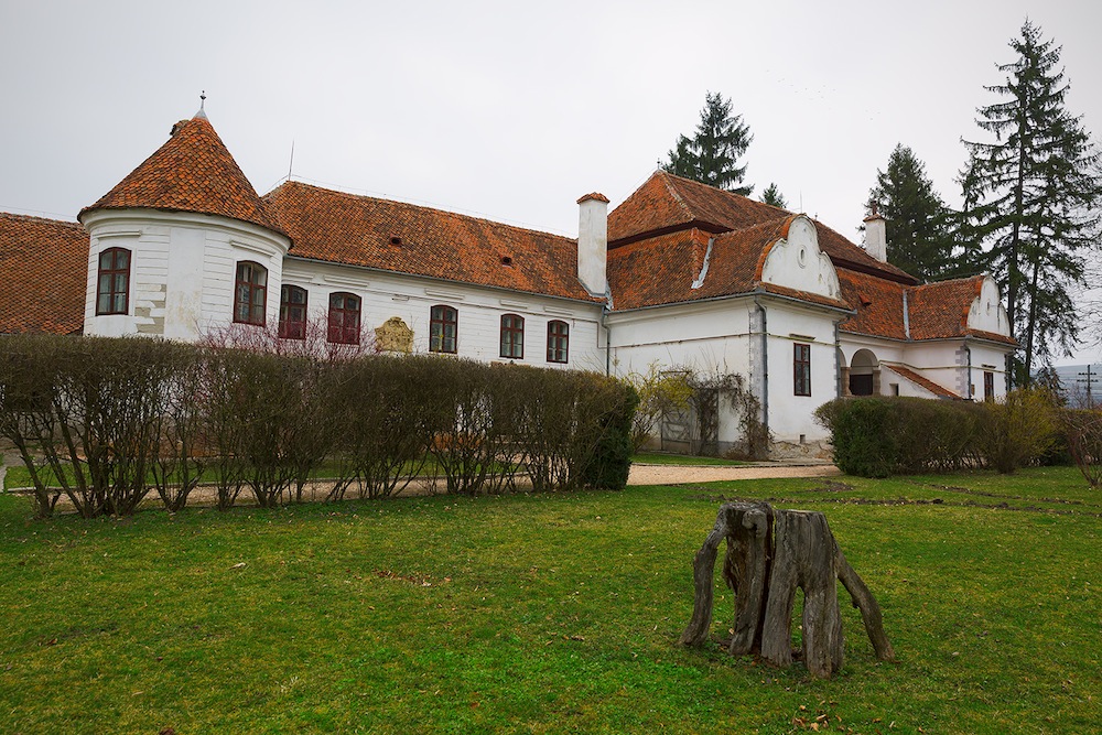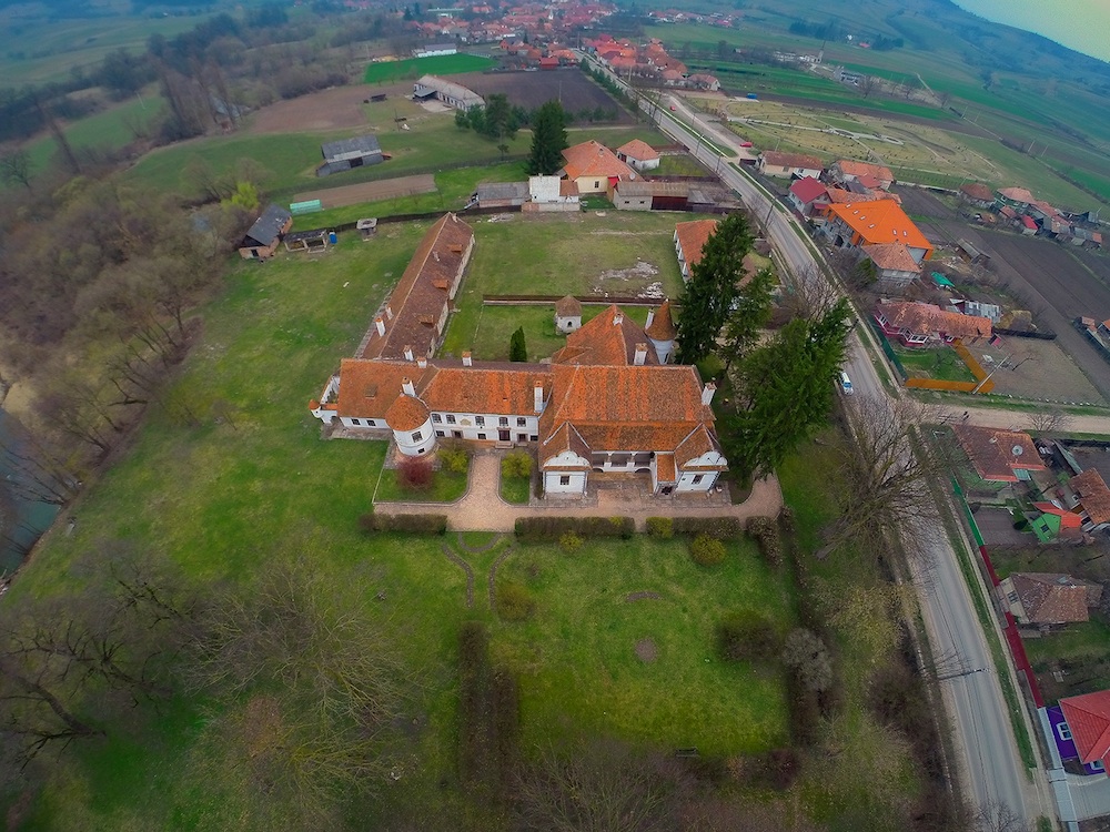Cea mai veche parte a ansamblului, cele două încăperi cu pereți mai groși ale clădirii principale, sala cu tavan plan și încăperea prevazută cu bolta casetată, dateaza de la secolului XVI. În sec. XVII, conacul s-a mărit cu mai multe încăperi, pe partea vestică. Probabil, tot atunci s-a construit și coridorul de apărare situat în partea de nord, astăzi fiind încorporat în blocul clădirii. Un ancadrament situat pe fațada sudică, prezintă emblema familiei, o lebădă, săgetată prin gât, împreună cu inițiala D și inscripția anului 46', face deasemenea referire la o construcție ulterioară.Cel mai spectaculos element structural al castelului îl constituie porticul cu arcade situat în partea de sud.