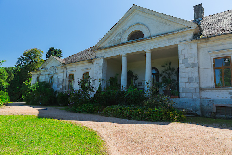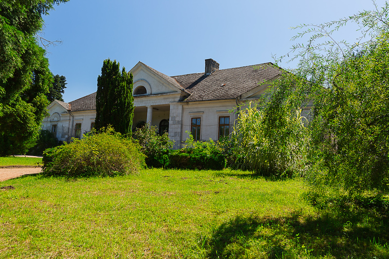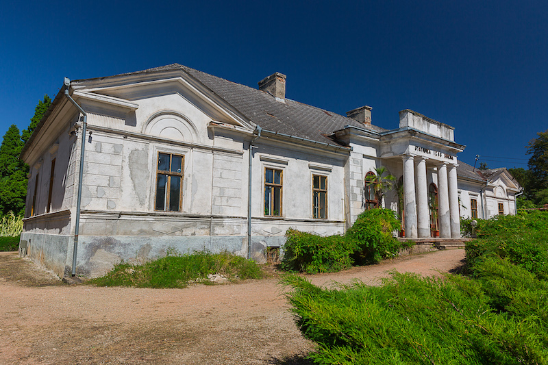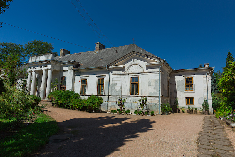 Fațada dinspre curte este articulată de trei rezalite, amplasate simetric, toate trei terminându-se cu un timpanon. Rezalitul central, care printr-o scară ornată duce spre grădină, este împărțit în trei părți, prin două perechi de coloane toscane, în spatele cărora se întinde un pridvor acoperit. Fațada dinspre strada principală este construită tot în stil clasicist, intrarea principală aflându-se în mijloc, în spatele a două perechi de coloane toscane. Mijlocul ambelor fațade este prevăzut câte trei-trei uși cu închidere semicirculară. Ferestrele clădirii sunt cu închidere verticală și au bordură simplă în partea de sus.
