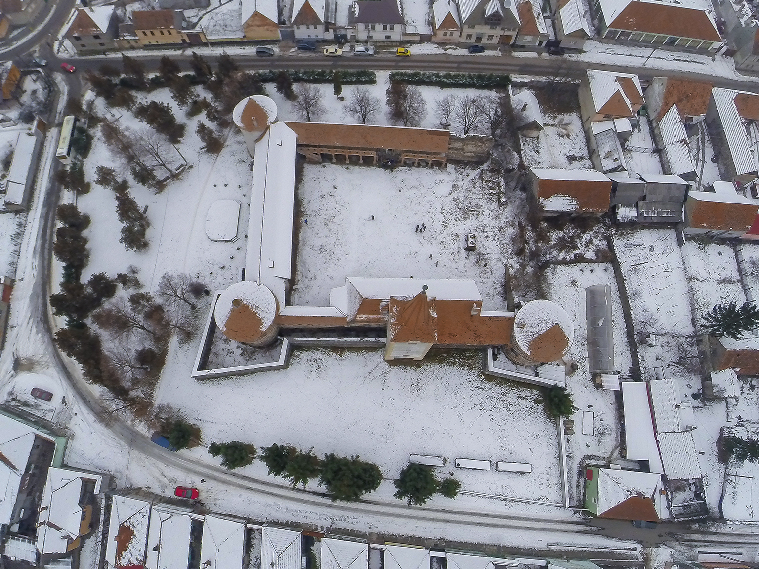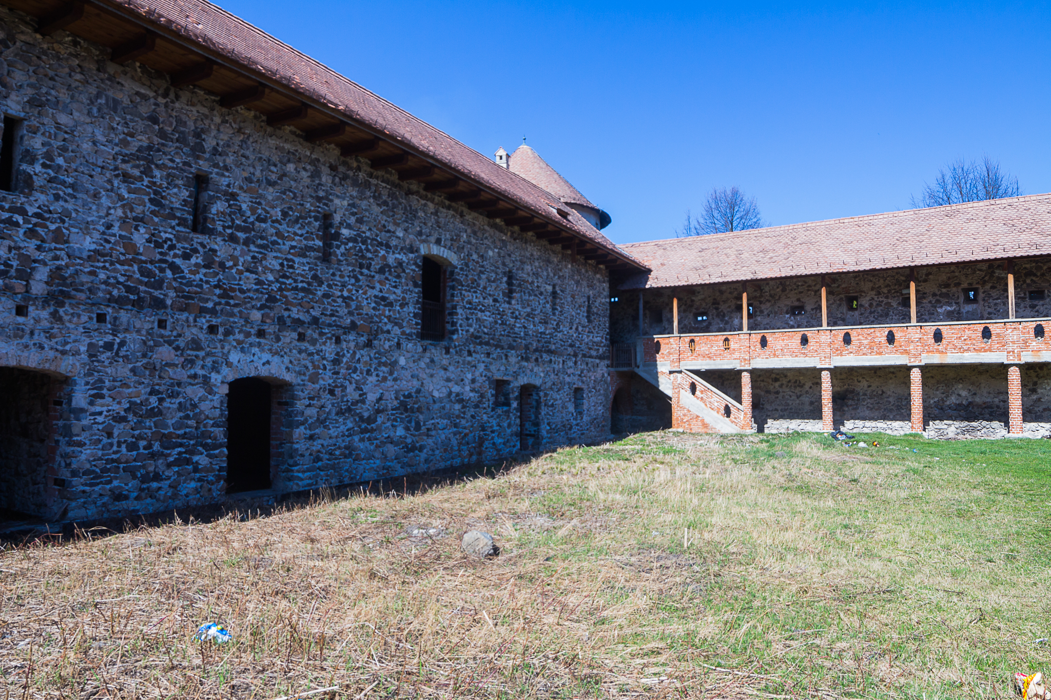 Acest pătrat formează castelul în sine. Pe exterior, bastioanele sunt fotificate cu ziduri scunde, construite în unghi ascuțit. Ansamblul era înconjurat de un șanț adânc de apă, traversarea făcându-se printr-un pod rabatabil, care dădea spre turnul porții. Pe lângă aceștia, castelul mai era înconjurat de un zid, din care au rămas doar turnurile colț și pe alocuri ziduri jose. Amplasarea interioară a aripii aristocratice reprezintă o bogăție și din punct de vedere istoric. La momentul actual, intrarea de la parter este înzidită, doar coloanele trei sferturi aflate pe părțile laterale și spațiile ale căror tavane se prăbușesc, coloanele din lemn care înlocuiesc cărămizile care se extindeau odinioară în paralel cu clădirea, indică aspectul de lux pe care l-a avut cândva castelul.Prin intermediul unei scări cu o rampă dreaptă se ajunge la intrarea festivă de la etaj, care dă direct în sala de consiliu. Sculptura ușii din lemn este compusă din două forme octogonale,, amplasate una peste alta, și bordate cu ornamente sub formă de lauri. Canturile ușii sunt decorate cu elemente sculptate. În mijlocul celo două octogoane se pot observa rozete bogate. Elementele sculptate ale ușii sunt schimbate cu uși de scândură, robuste. Canatul este încadrat în piatră roșie, a cărei rază de lemn este în contrast puternic cu partea exterioară, simplă, a clădirii (doar ferestrele sălii de conferințe sunt prevăzute cu arhitectura simplă a unui timpanon). Cel mai probabil, lucrările din perioada Renașterii târzii s-au efectuat atunci când castelul i-a aparținut contelui Bethlen Samu.