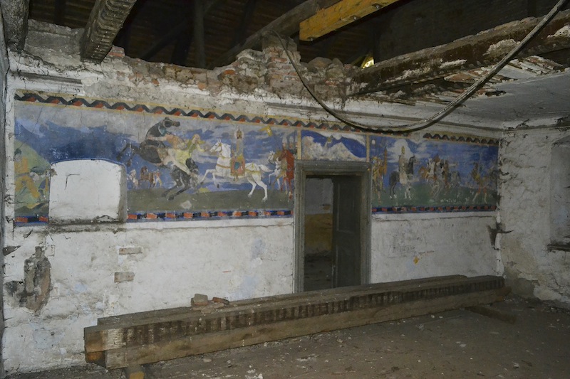 În sala cu tavan cu grinzi de lemn, se observă pictura inspirată din istorie a lui Varga Nándor Lajos.